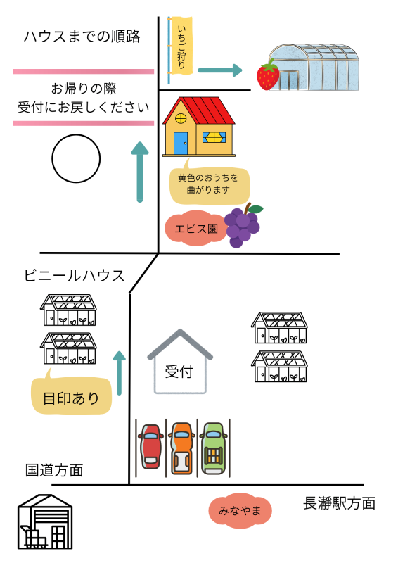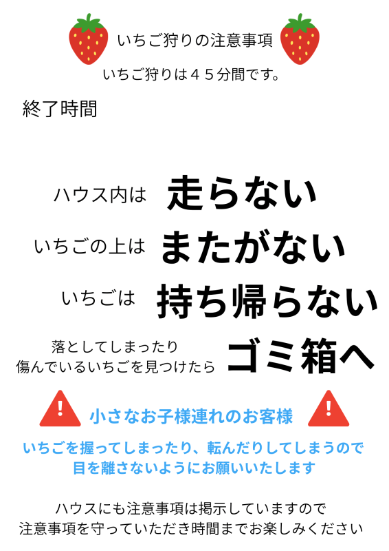 受付にて、ハウスまでの道順・終了時間の案内があります。いちご狩りの時間➕移動時間を加味した時間となります。